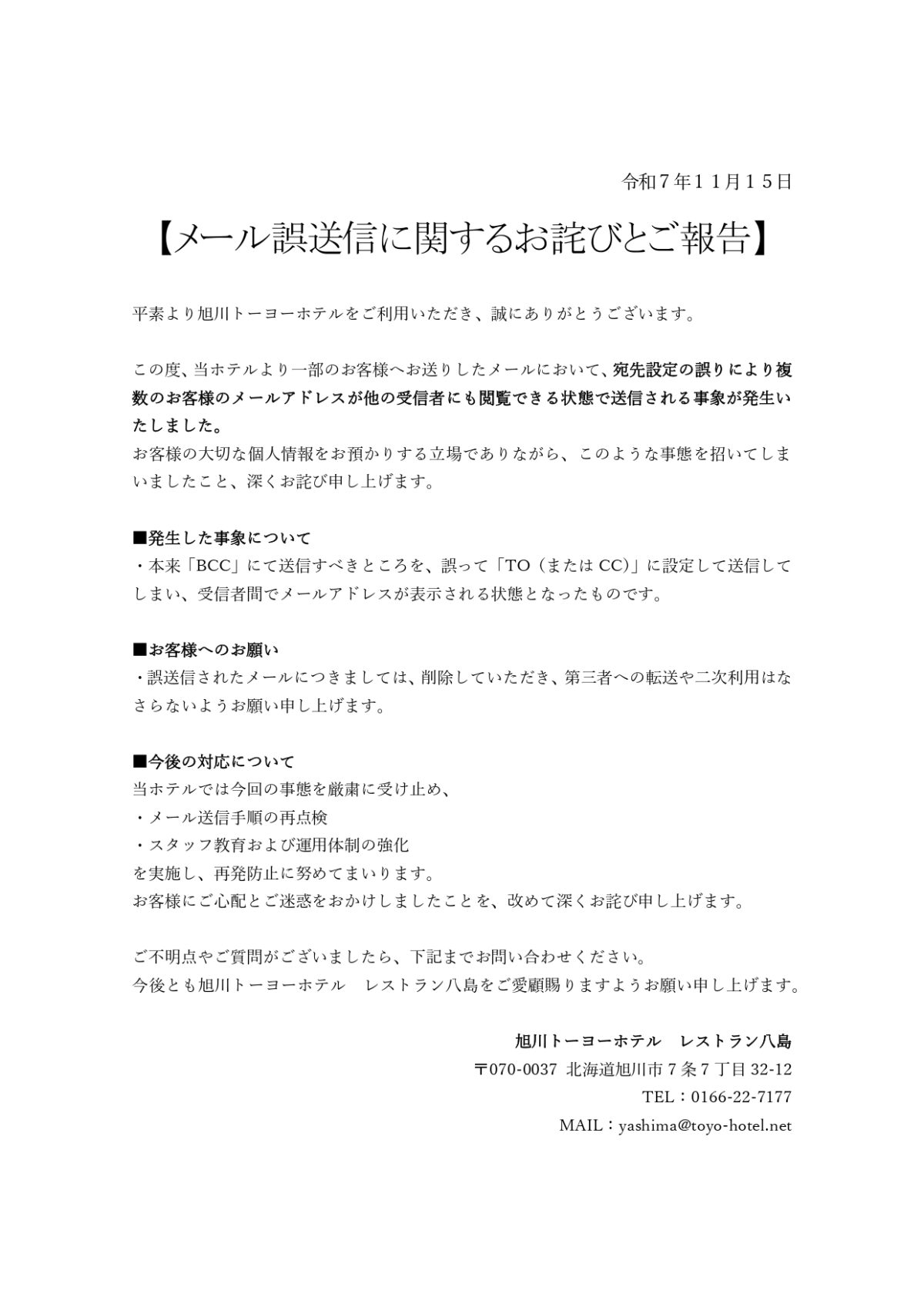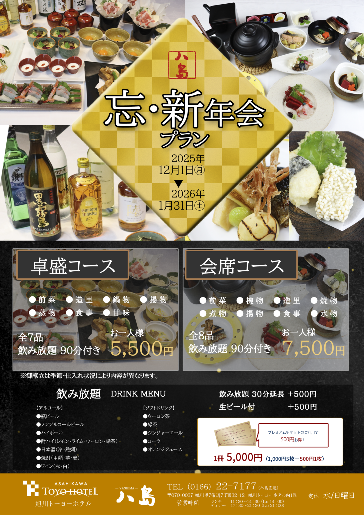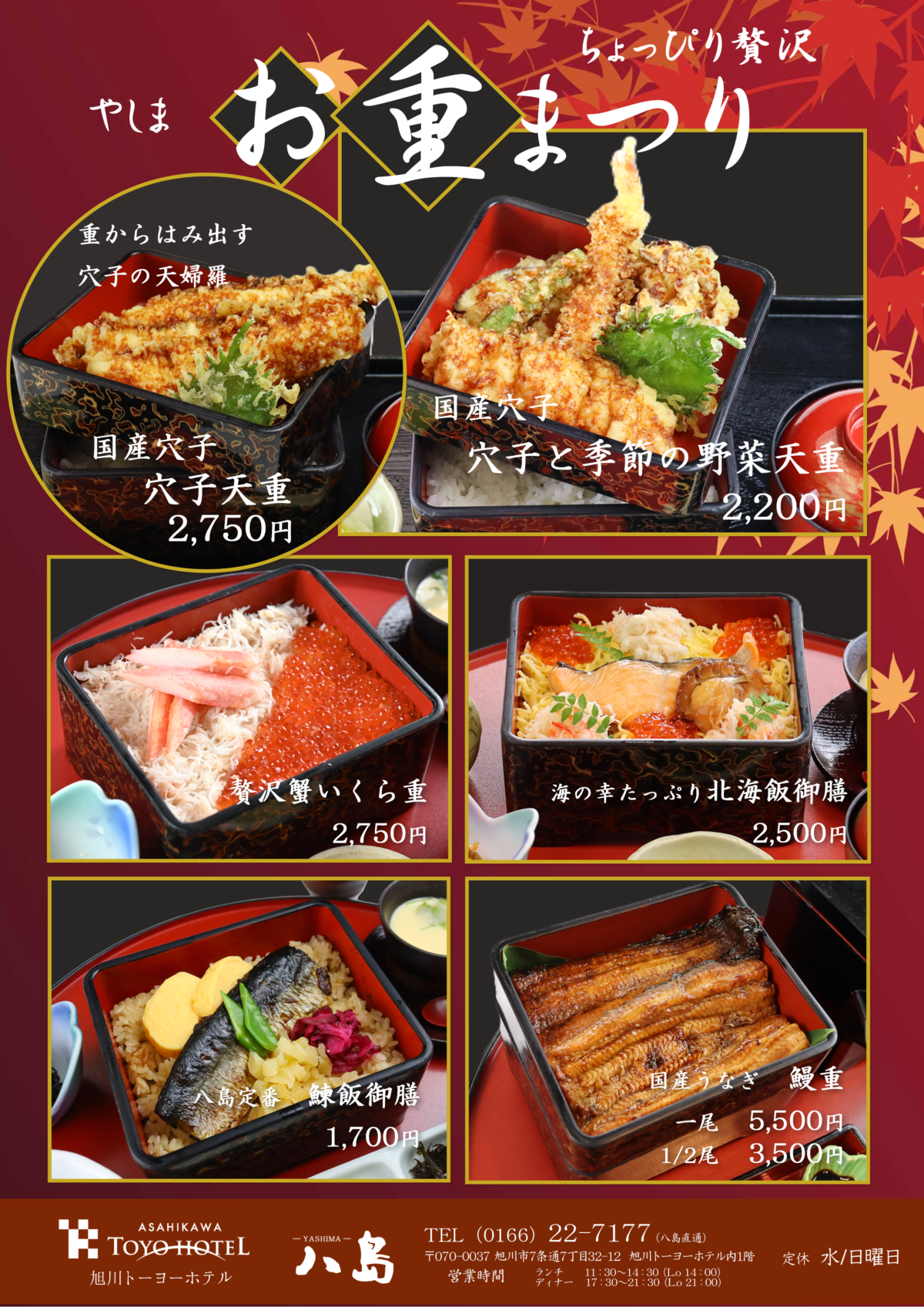 11月末までにご予約で1,500円分、ホテルでのお引き取りで1,500円分の八島お食事券進呈